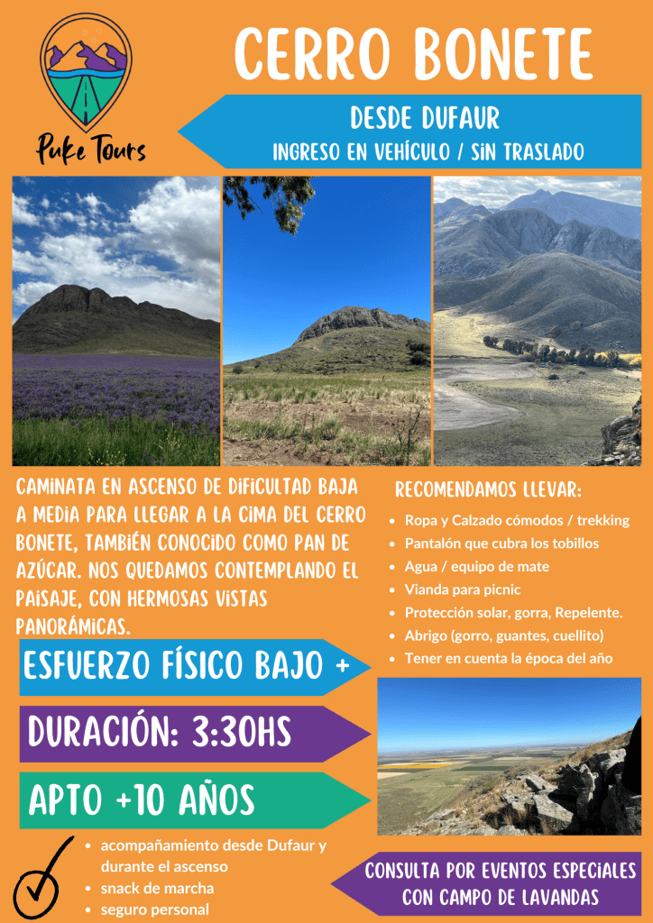 El cerró Bonete, también llamado Pan de azúcar, está ubicado a 17 km aprox de Dufaur.