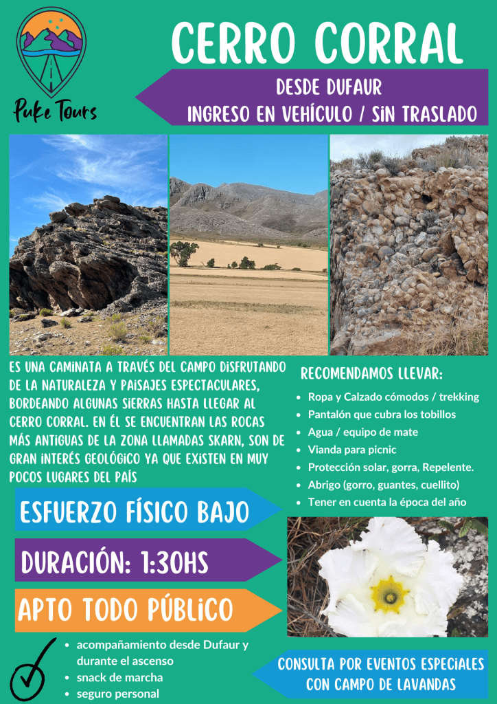 El cerro Corral se ubica a 17 km de la localidad de Dufaur