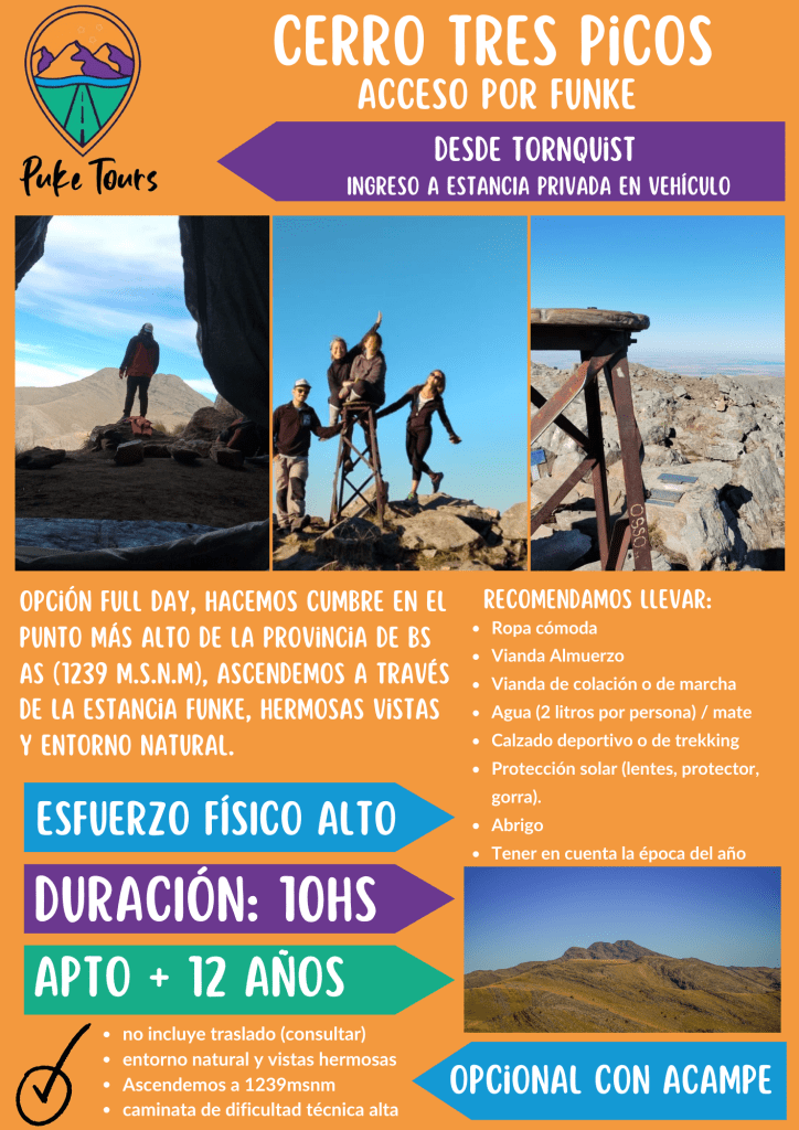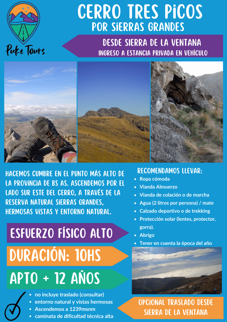 Para esta aventura hacia el punto más alto de la provincia de Buenos Aires, tenemos para ofrecerte dos opciones llenas de emoción hasta la cumbre de 1239 msnm. El Cerro Tres Picos se encuentra en el Partido de Tornquist, a 650km aproximadamente de la Ciudad de Buenos Aires. Encabeza al Cordón Ventania con su altura máxima.