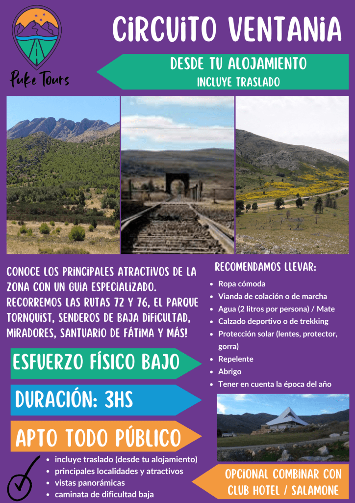 La excursión está pensada para parejas, familias o grupos que tengan ganas de conocer los principales atractivos turísticos que encontraremos hacia la zona del Hueco Ventana y el Parque Tornquist.