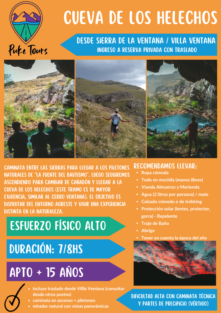 Se trata de una caminata entre las sierras de dificultad media para llegar a los piletones naturales de «La Fuente del Bautismo» junto con su caída de agua de 10m aproximadamente. Luego, seguiremos ascendiendo para cambiar de cañadón y llegar a Cueva de los Helechos (este tramo es de mayor exigencia, similar al Cerro Ventana). El objetivo es disfrutar del entorno agreste y vivir una experiencia diferente en contacto con la naturaleza.