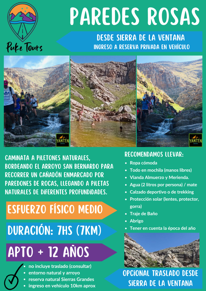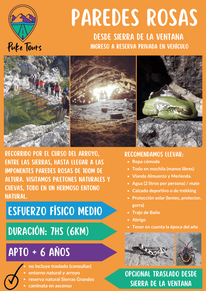 En caso de venir con niños, deben ser mayores de 6 años, acostumbrados a caminar, sin una vida sedentaria, es decir que hagan alguna actividad física en su día a día (correr, andar en bici, hacer algún deporte, etc.). Tengamos en cuenta que es una actividad de todo el día y puede resultar cansadora, sobre todo en verano cuando estamos muy expuestos al rayo del sol. Por ello, recomendamos tomar todas las precauciones necesarias para cuidarnos del sol. También aconsejamos que esta bueno tener experiencia previa en algún trekking similar, si aún no realizaron ninguno, estas dos opciones son copadas para comenzar: Los Piletones o Garganta Olvidada, dos senderos autoguiados que pueden realizar dentro del Parque E. Tornquist – Ventania.